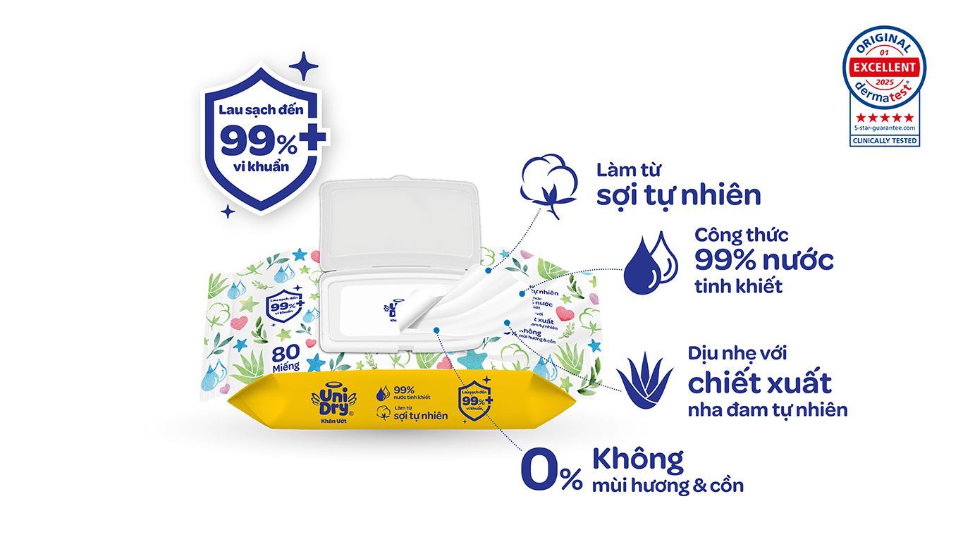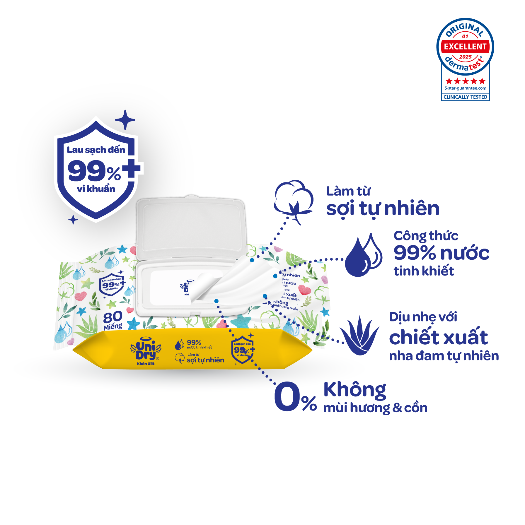 Khăn ướt UniDry là khăn ướt kháng khuẩn được làm từ thành phần lô hội tự nhiên, không chứa cồn, an toàn tuyệt đối cho làn da nhạy cảm của bé. Sản phẩm giúp mẹ dễ dàng làm sạch cho bé trong mọi tình huống, mang lại cảm giác mềm mại