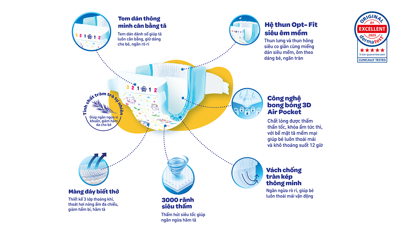 UniDry hiểu rằng sự thoải mái và khô thoáng là yếu tố quan trọng hàng đầu đối với làn da nhạy cảm của bé, đặc biệt là trong giai đoạn sơ sinh và những tháng đầu đời. Tã dán UniDry Siêu Khô Thoáng được thiết kế đặc biệt để mang lại sự vừa vặn hoàn hảo và khả năng thấm hút vượt trội. Hệ thun Opt-Fit siêu êm mềm ở hông và đùi ôm nhẹ nhàng theo đường cong tự nhiên của bé, không gây hằn da mà vẫn đảm bảo sự chắc chắn, chống tràn hiệu quả. Tem dán thông minh cân bằng tã với các vạch chỉ dẫn trực quan giúp mẹ dễ dàng điều chỉnh miếng dán sao cho cân đối, vừa vặn với cơ thể bé ở mọi tư thế. Bề mặt thoáng khí, lõi thấm hút vượt trội với 3000 rãnh và hạt siêu thấm giữ bé khô ráo đến 12 giờ. Tinh chất tràm trà tự nhiên kháng khuẩn, khử mùi, bảo vệ da bé toàn diện.