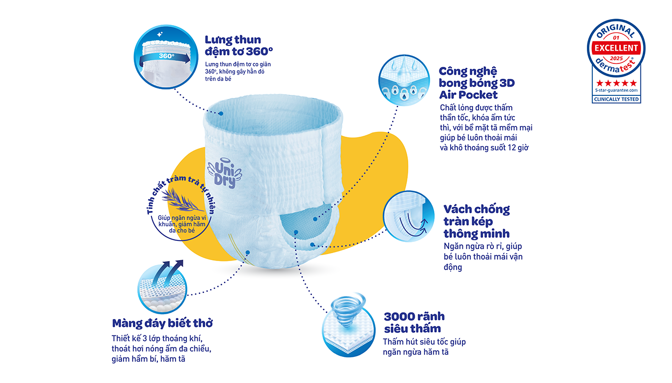 Tã quần UniDry Siêu Khô Thoáng là lựa chọn lý tưởng dành cho những bé yêu năng động để bé thoải mái vận động suốt ngày dài. Với công nghệ tiên tiến, sản phẩm sở hữu bề mặt thoáng khí vượt trội, giúp không khí lưu thông tối đa, giảm thiểu tình trạng hầm bí và khó chịu cho bé. Lõi thấm hút mạnh mẽ với các hạt siêu thấm khóa chặt chất lỏng ngay lập tức, ngăn ngừa thấm ngược hiệu quả, giữ cho da bé luôn khô ráo đến 12 giờ. Thiết kế lưng thun mềm mại, co giãn linh hoạt theo từng cử động của bé, không gây hằn da. Đặc biệt, tinh chất tràm trà tự nhiên được tích hợp giúp kháng khuẩn và khử mùi hiệu quả, mang lại cảm giác tươi mát và dễ chịu cho bé yêu.